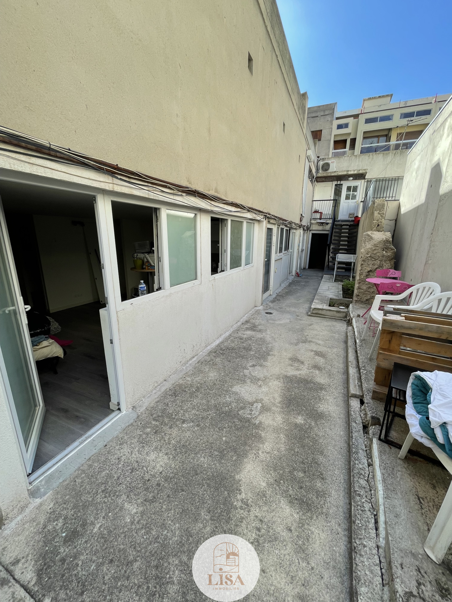 AU RDC donnant sur cour, Grand Studio de 25 m² avec cuisine ouverte semi équuipée, placard intégré, salle d'eau avec WC,