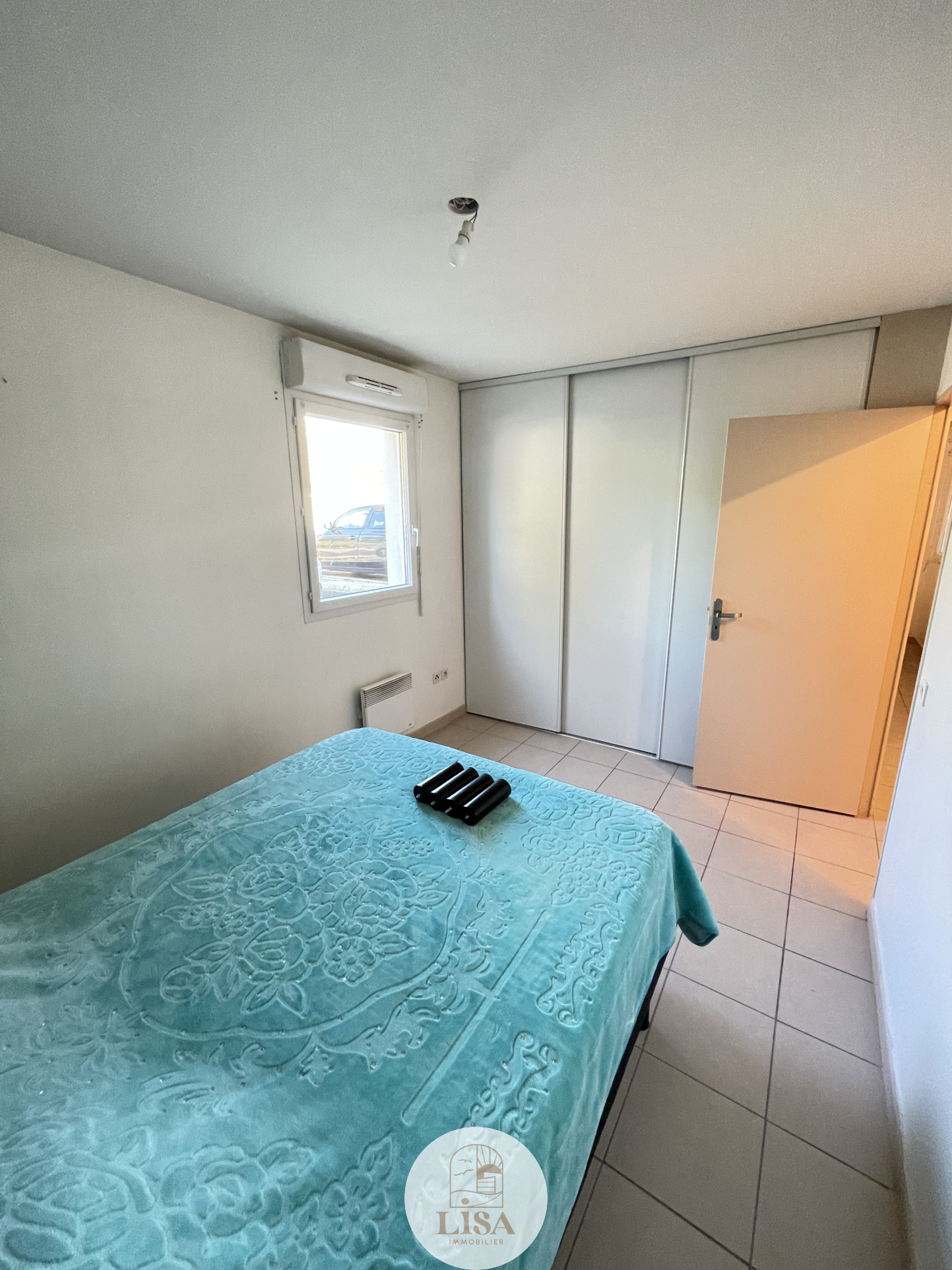 Chambre avec placard intégré, salle de bain, wc, salon ,cuisine.