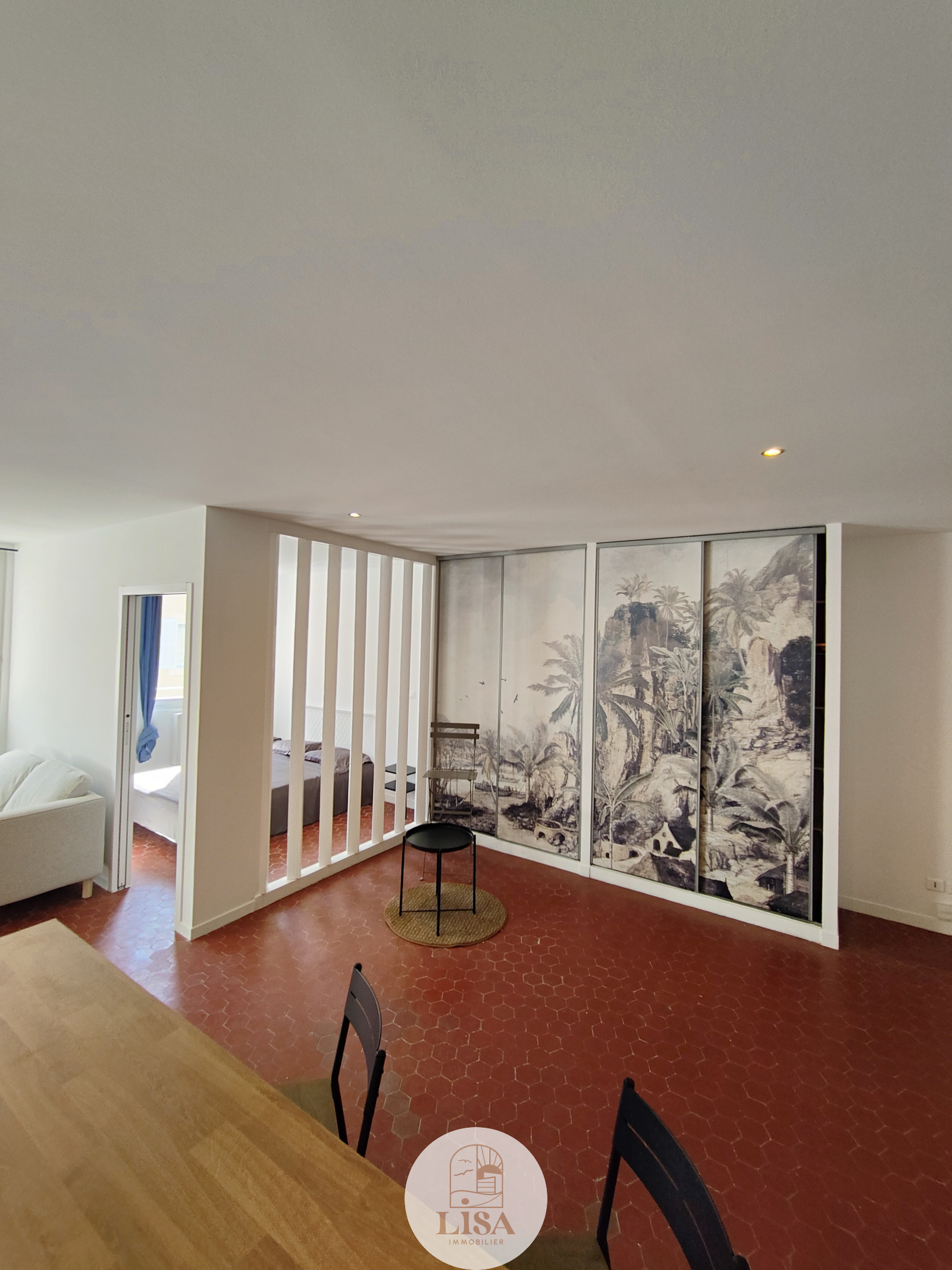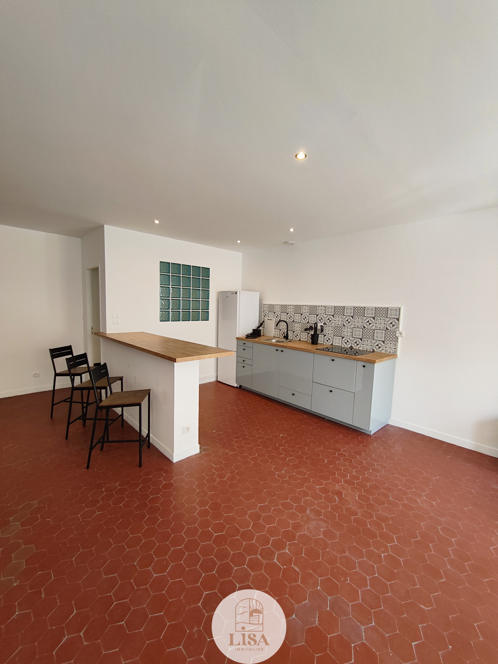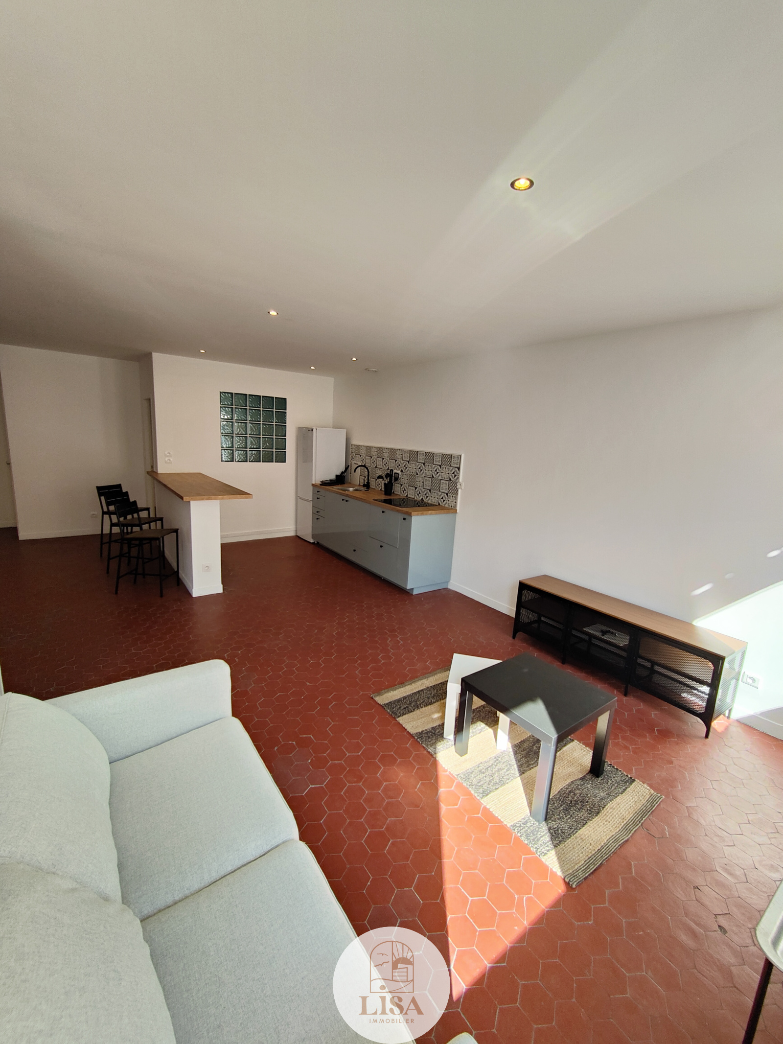 Magnifique pièce de vie 45 m2 entièrement équipée et aménagé avec tomettes au sol, grand séjour ouvert sur la cuisine américaine toute équipée, 1 Chambre, 1 salle de bain avec machine à laver, WC séparé, climatisation mobile