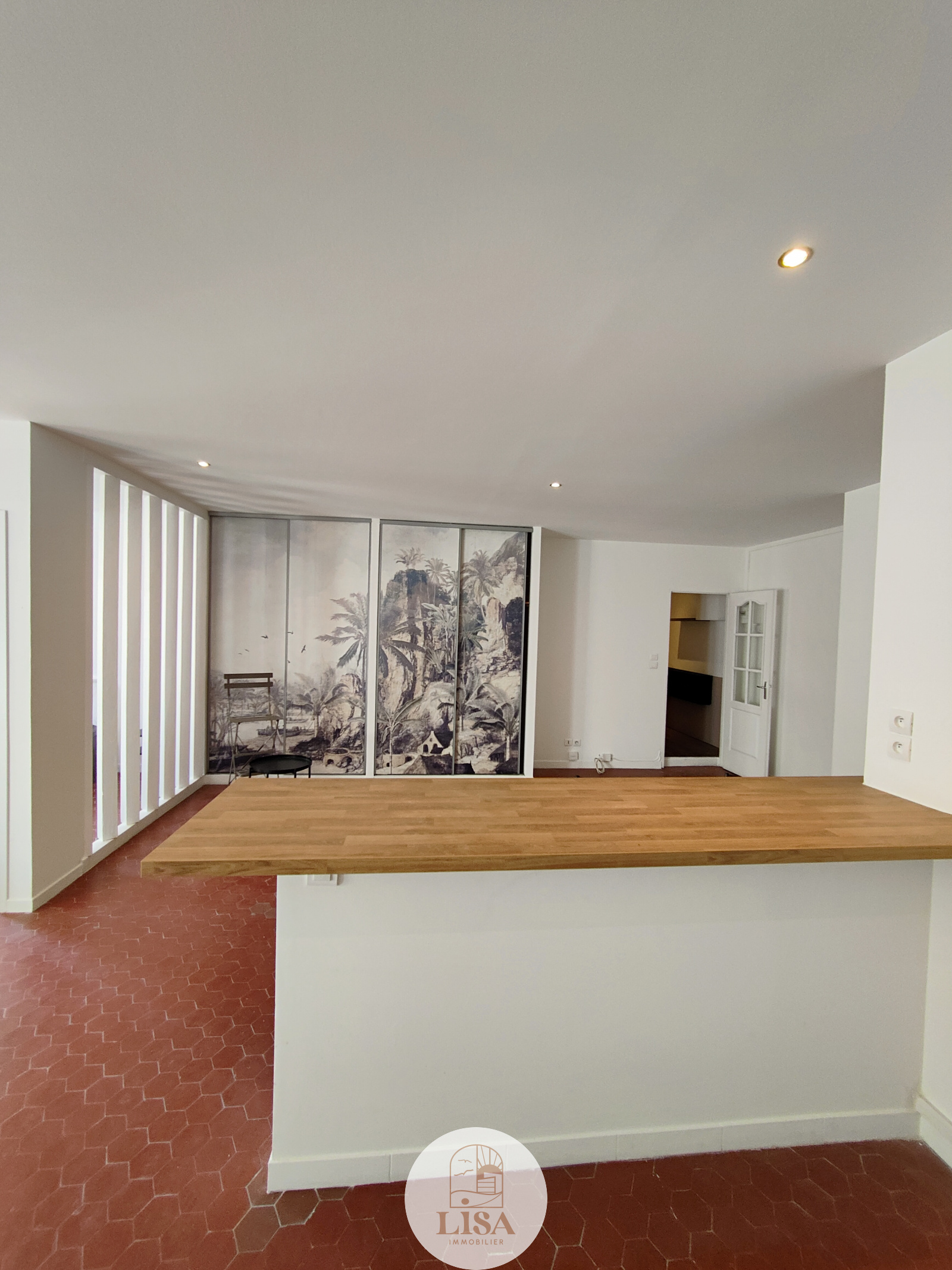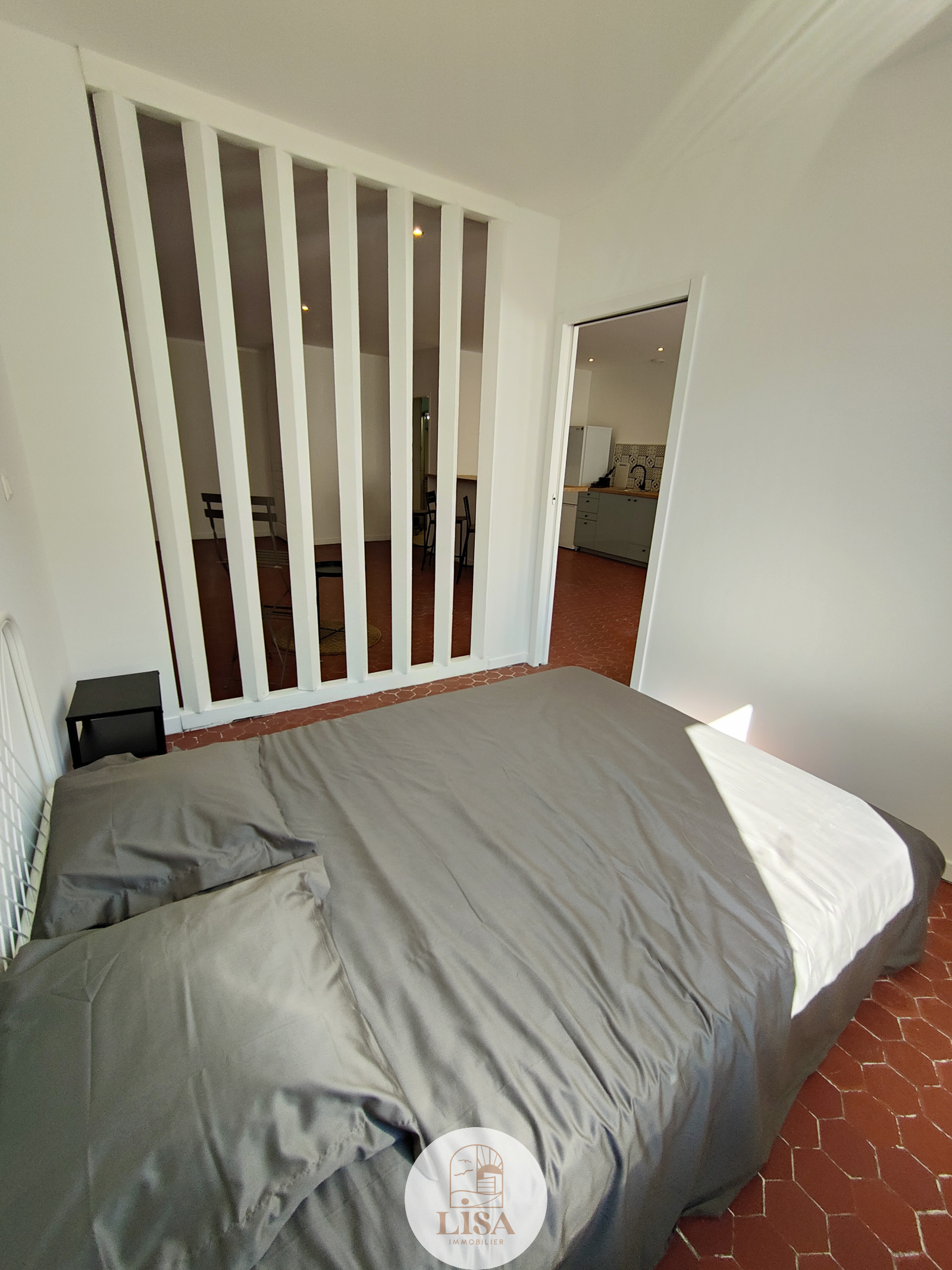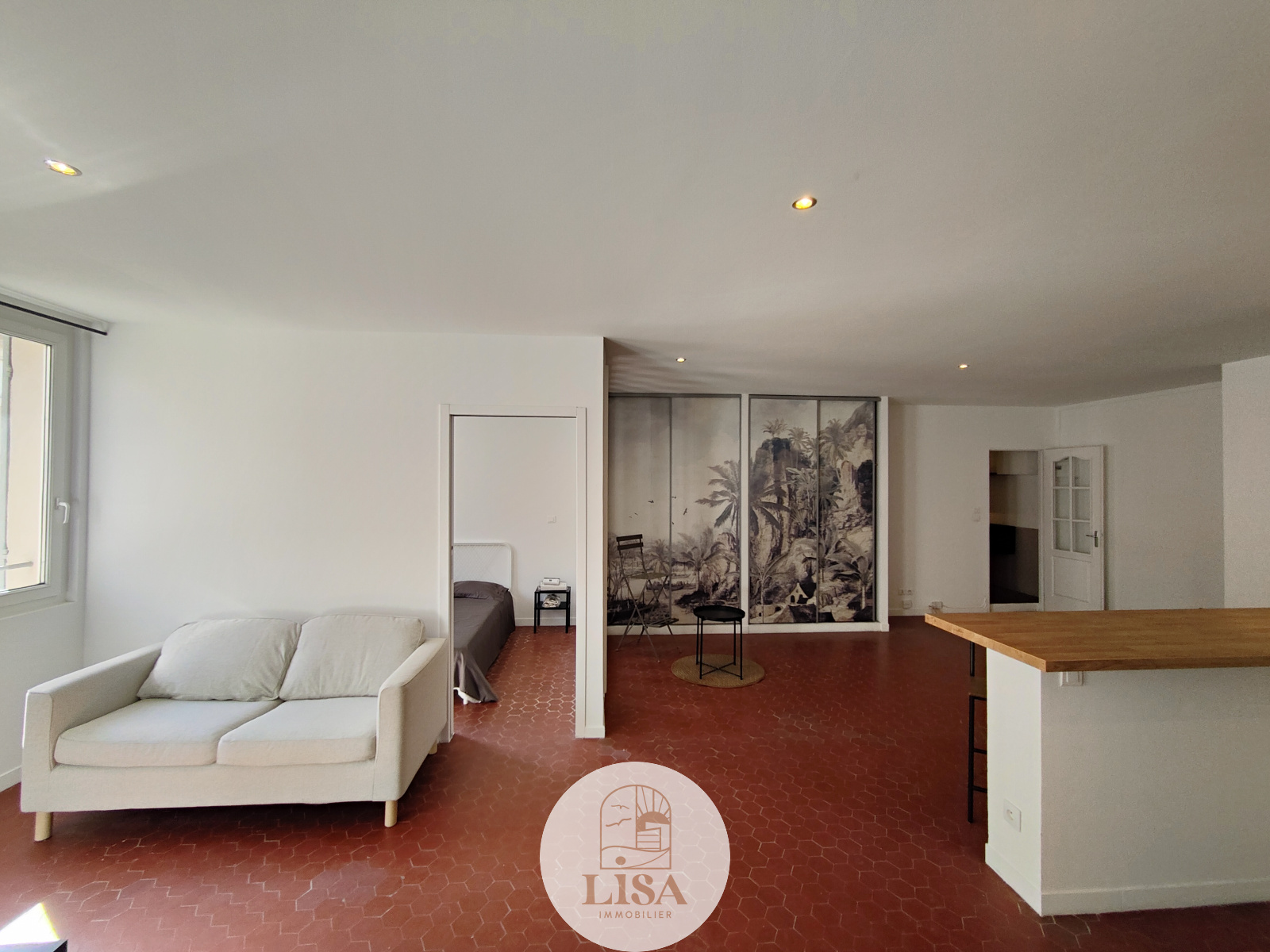 Magnifique pièce de vie 45 m2 entièrement équipée et aménagé avec tomettes au sol, grand séjour ouvert sur la cuisine américaine toute équipée, 1 Chambre, 1 salle de bain avec machine à laver, WC séparé, climatisation mobile